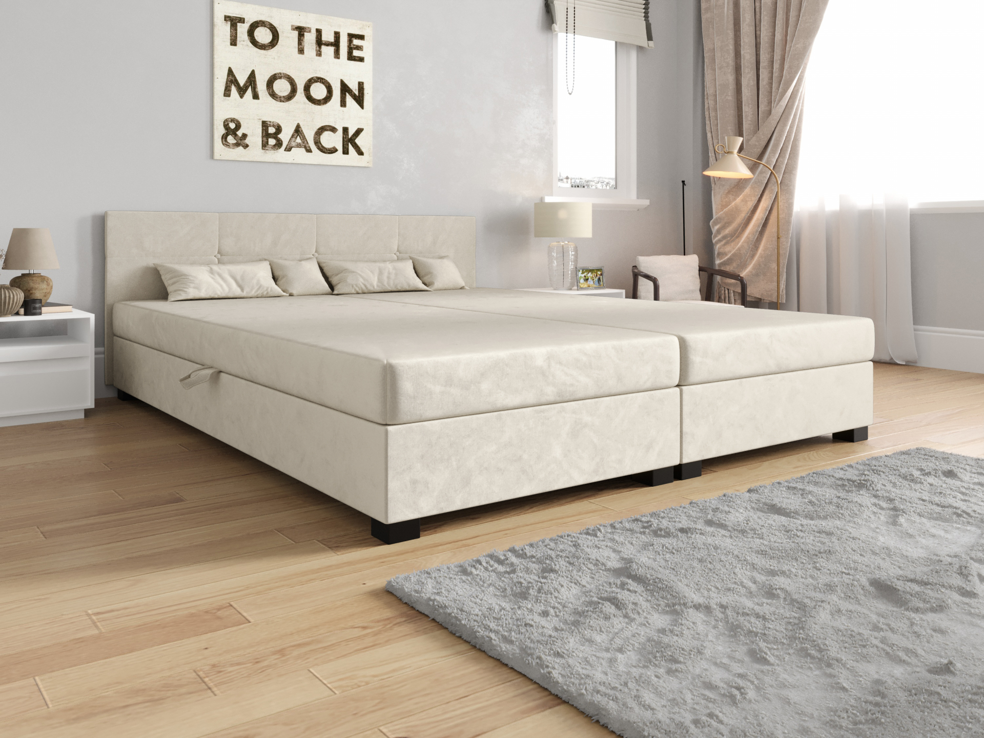 Hatalmas, oldalról nyitható ágynemütartóval rendelkezik.